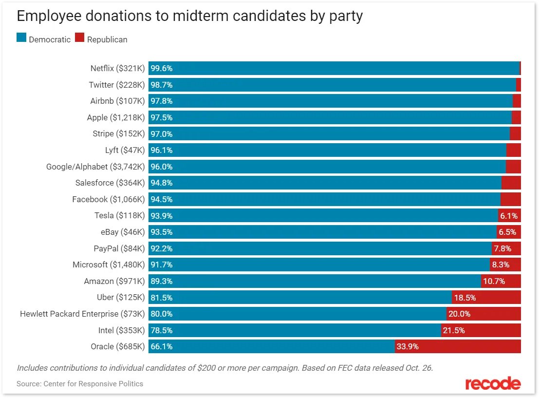 テックの社員は政治的な左派との連携で有名で、2018年の米国中間選挙では、グーグルの社員の96%が民主党に寄付した。