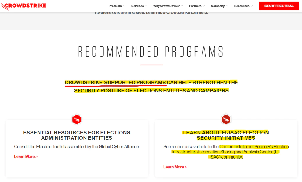 クラウドストライク社は、選挙設備保護に重要な役割をするインターネット・セキュリティ・センター (CIS) および選挙設備情報共有・分析センター(EI-ISAC) と提携し、”選挙を守るグローバルリーダー”を自称している。