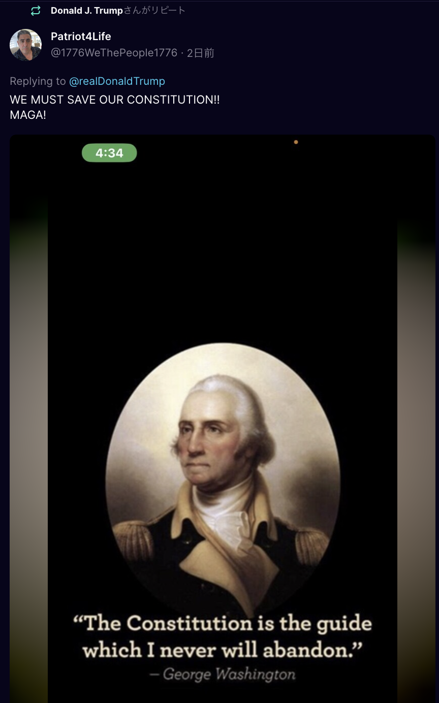 Patriot4Lifeさんがジョージ・ワシントンの憲法に関するミームを引用して、「憲法を守るべきだ」という意見をトランプ氏がリピート投稿したものになります。