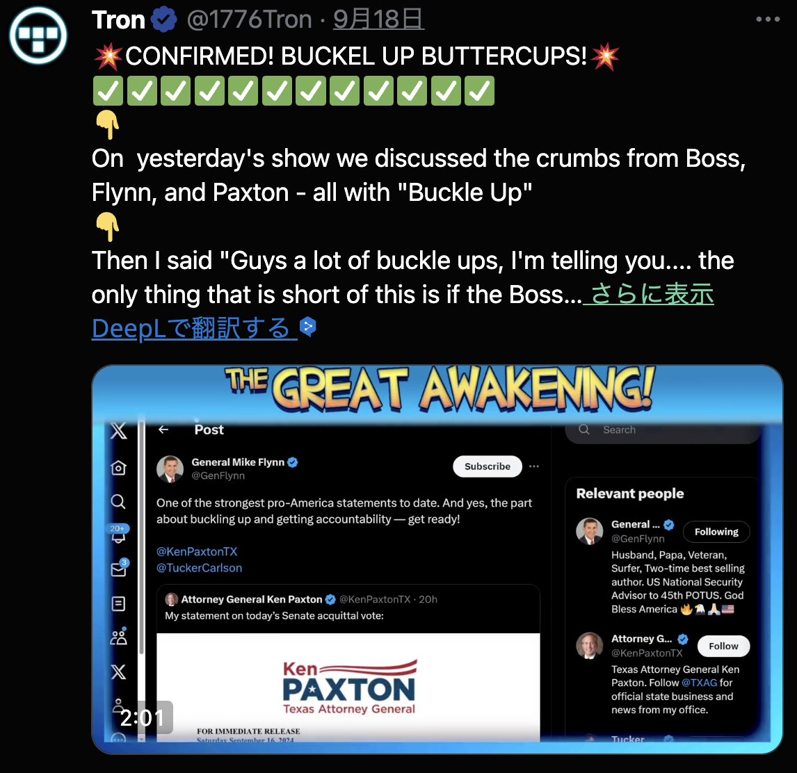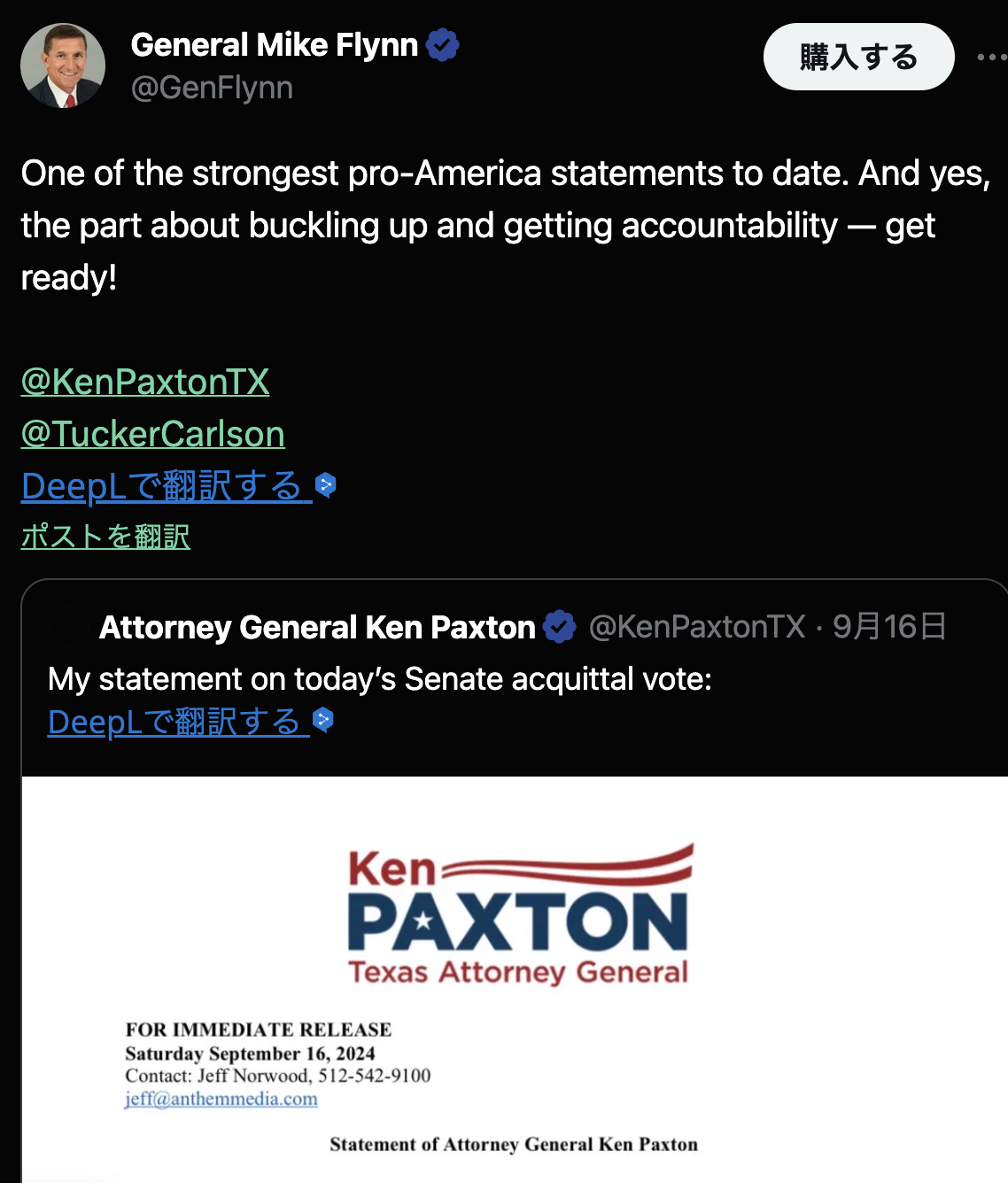 そしてこちらはフリン将軍の9月16日の引用投稿で、ケン・パクストン氏の投稿のなかの「シートベルトを締めて」の部分を強調しています。