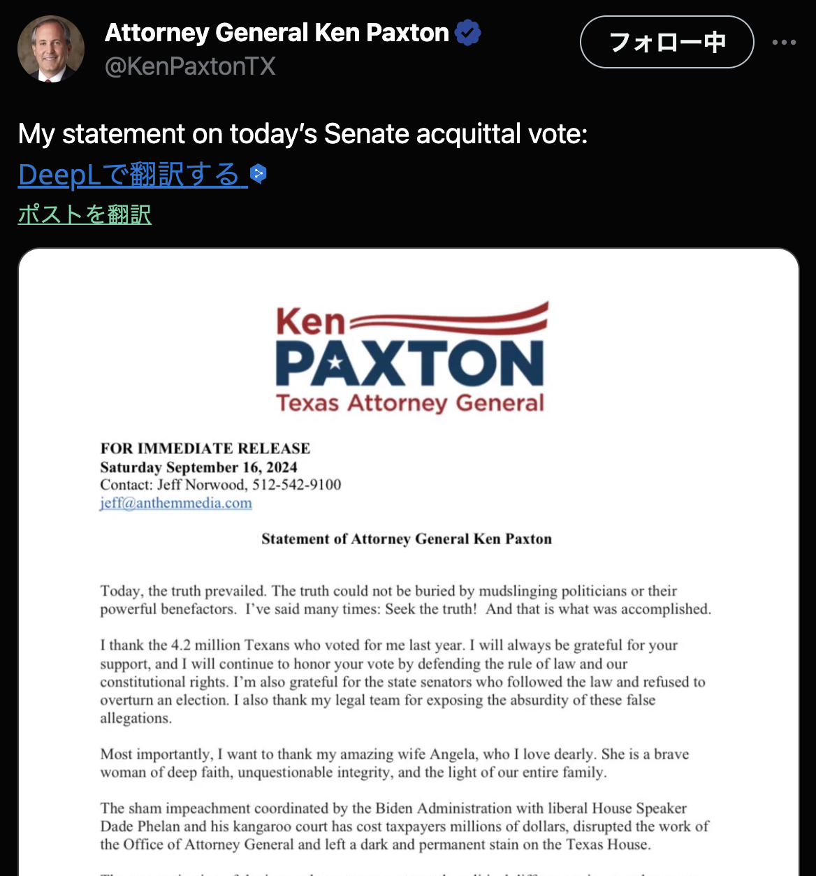 こちらは、テキサス州司法長官のケン・パクストン氏が弾劾裁判で無罪になった後に出した声明です。
