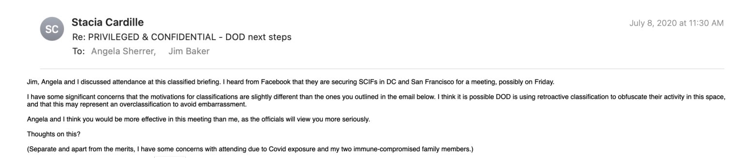 もう一人のツイッターの弁護士であるステーシア・カーディル氏は、国防総省はSCIFを望んでおり、ソーシャルメディア活動を遡及的に分類したいのかもしれないと答えました。