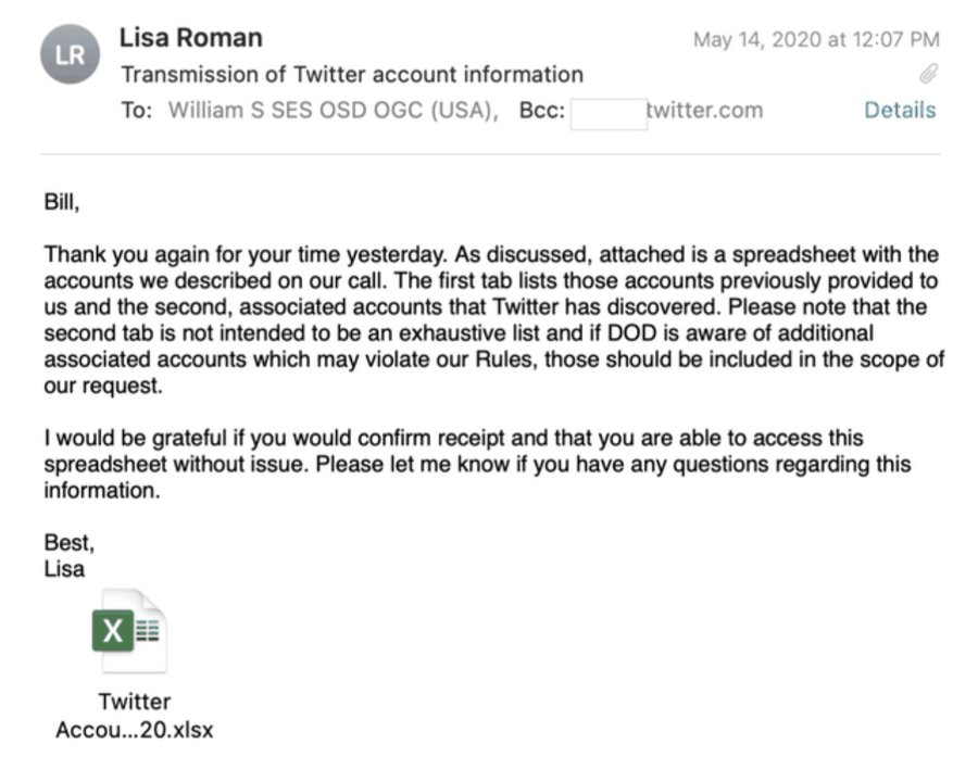 2020年5月、ツイッターのリサ・ローマンは国防総省に2つのリストを電子メールで送りました。
