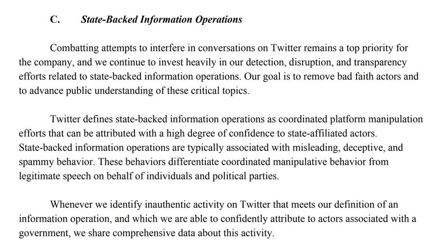 こちらは、国家に支援された秘密情報操作と欺瞞的プロパガンダを迅速に特定し、停止させるというツイッターの議会での証言です。