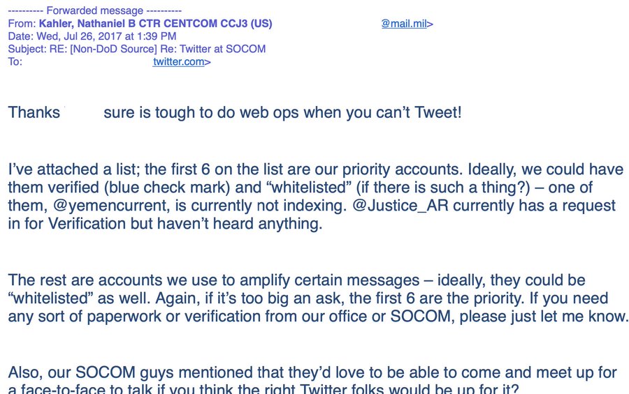 2020年の他のいくつかの電子メールでは、ツイッターの上級幹部/弁護士は、秘密のネットワークについて議論し、さらにアメリカ中央軍からの2017年のリストを再循環させ、157の非公開のペンタゴンアカウントの別のリストを共有しました。