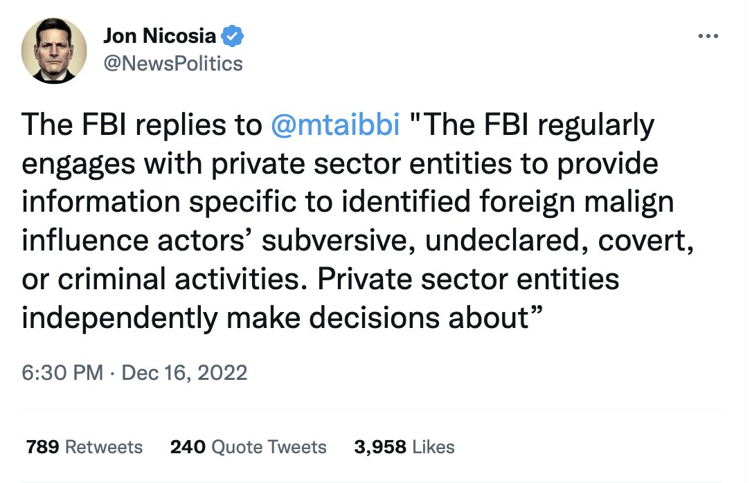 FBIは金曜日(2022年12月16日)の報告書(ツイッターファイル Part 6)に対して、「定期的に民間団体と関わり、特定された外国の悪意ある影響行為者の破壊活動、未申告、秘密活動、犯罪活動に特化した情報を提供している」と回答しています。