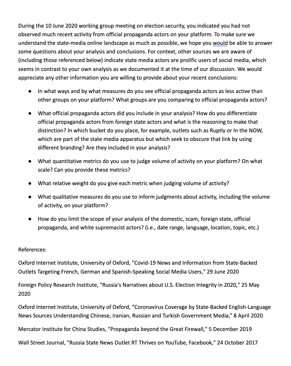 2020年6月のブリーフィングで、私たちは 「あなたのプラットフォームで公式プロパガンダの活動家からの最近の活動をあまり観察していない」と示したわけではありません。
