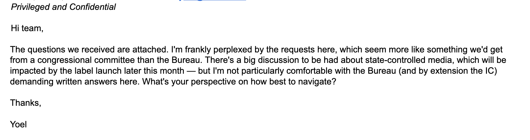 彼は、「FBI(ひいては諜報機関共同体)が文書による回答を要求するのは心地よくありません」と付け加えました。