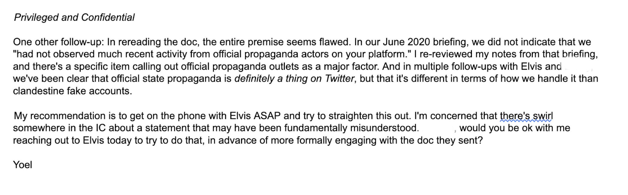 ヨエル・ロスは「至急エルヴィス・チャンと電話をして、この問題を解決しよう」と提案し、国家的なプロバガンダがツイッターで「行われていない」という概念を諜報機関に植え付けようとしました。