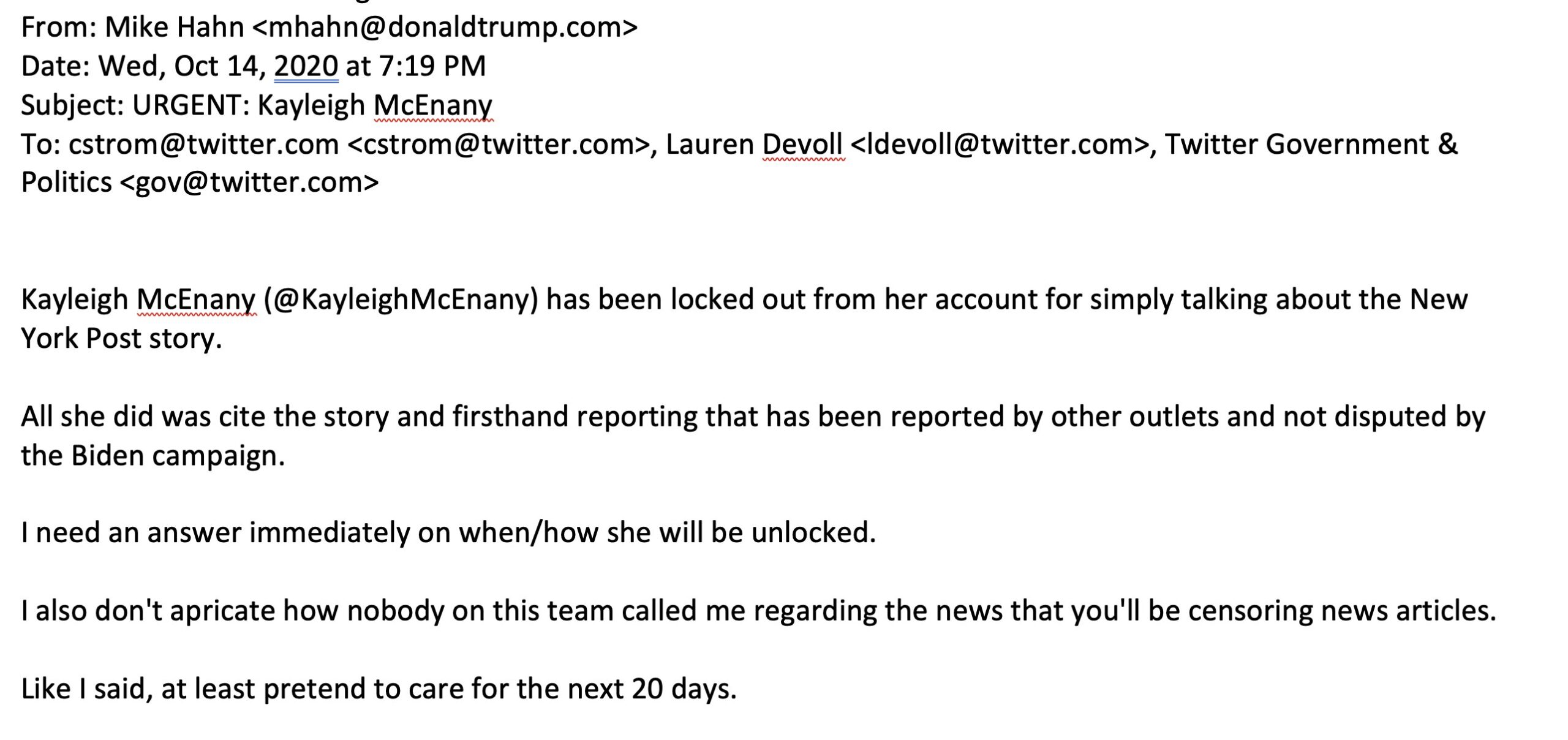 From: Mike Hahn mhahn@donaldtrump.com Date: Wed, Oct 14, 2020 at 7:19 PM Subject: URGENT: Kayleigh Manany To: cstrom@twitter.com cstrom@twitter.com、Lauren Devoll Idevoll@twitter.com、Twitter Government & Politics gov@twitter.com