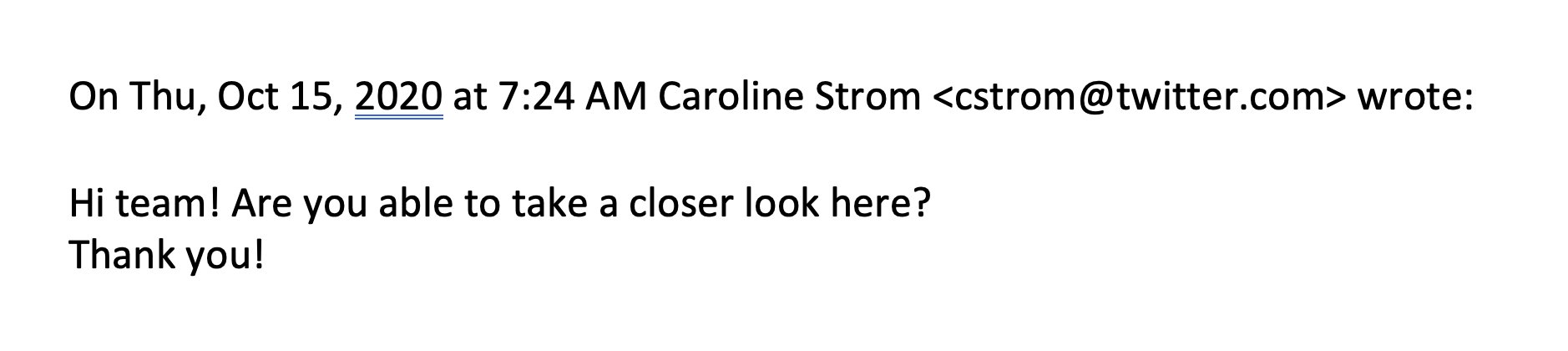 On Thu, Oct 15, 2020 at 7:24 AM Caroline Strom cstrom@twitter.com wrote: