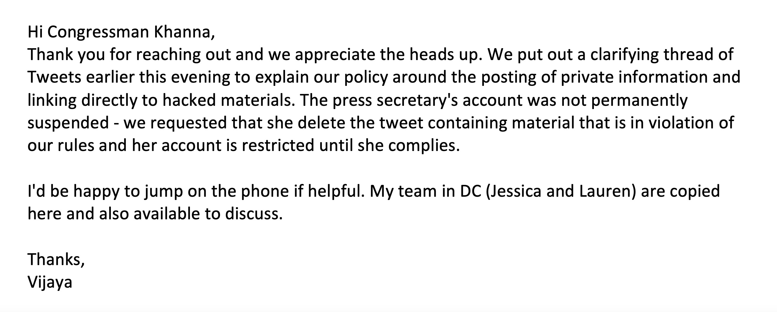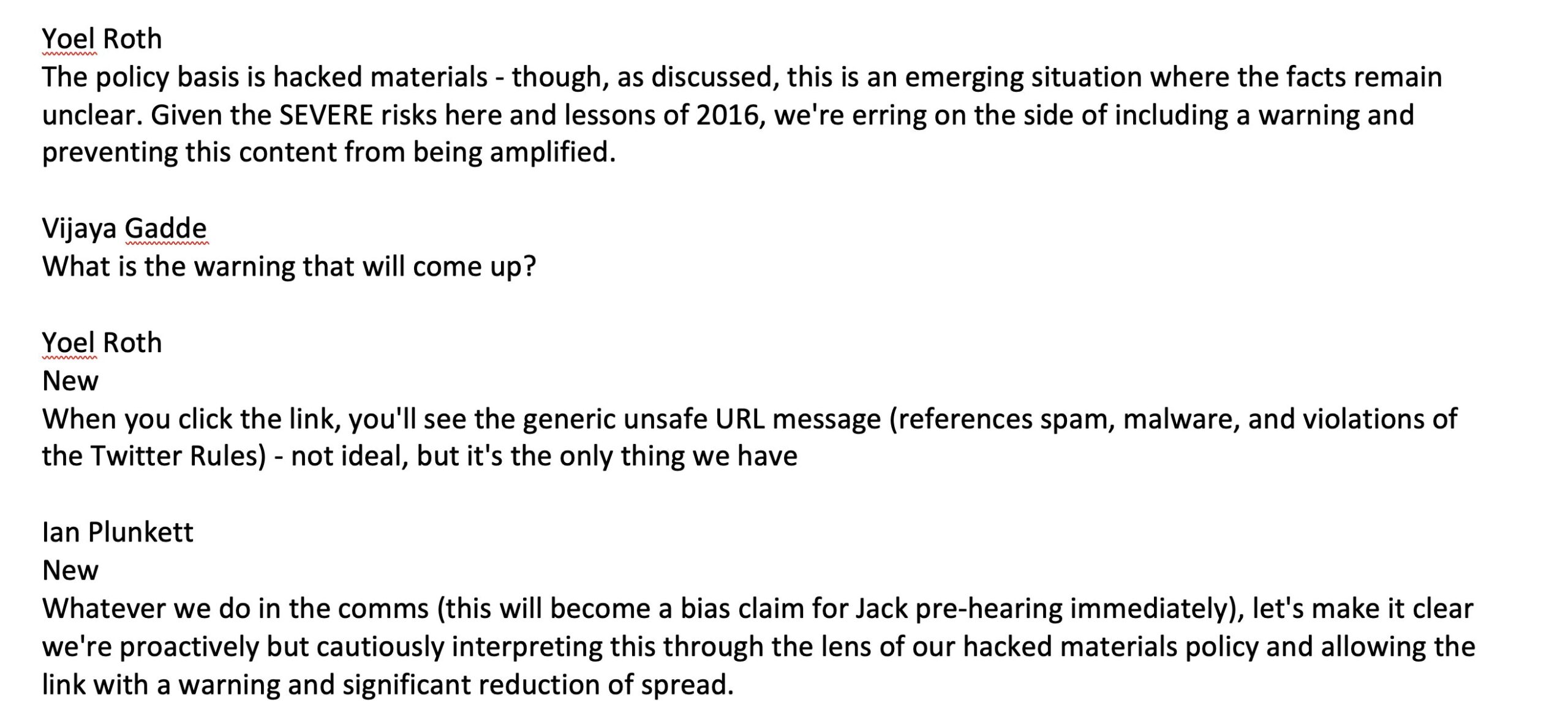 この決定は会社の最高レベルで行われましたが、CEOのジャック・ドーシーが知らないところで行われ、法務・政策・信頼の元責任者ビジャヤ・ガッデが重要な役割を担っていました。