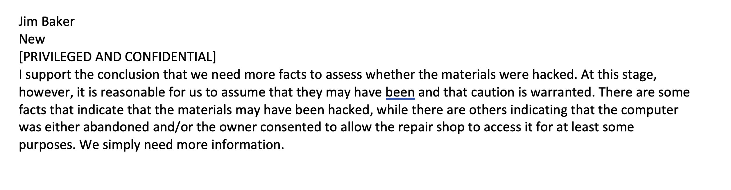 資料がハッキングされた可能性を示す事実がいくつかある一方で、コンピュータが放棄されていたこと、または、少なくとも何らかの目的で修理工場がそれにアクセスすることを所有者が承諾したことを示す事実もある。