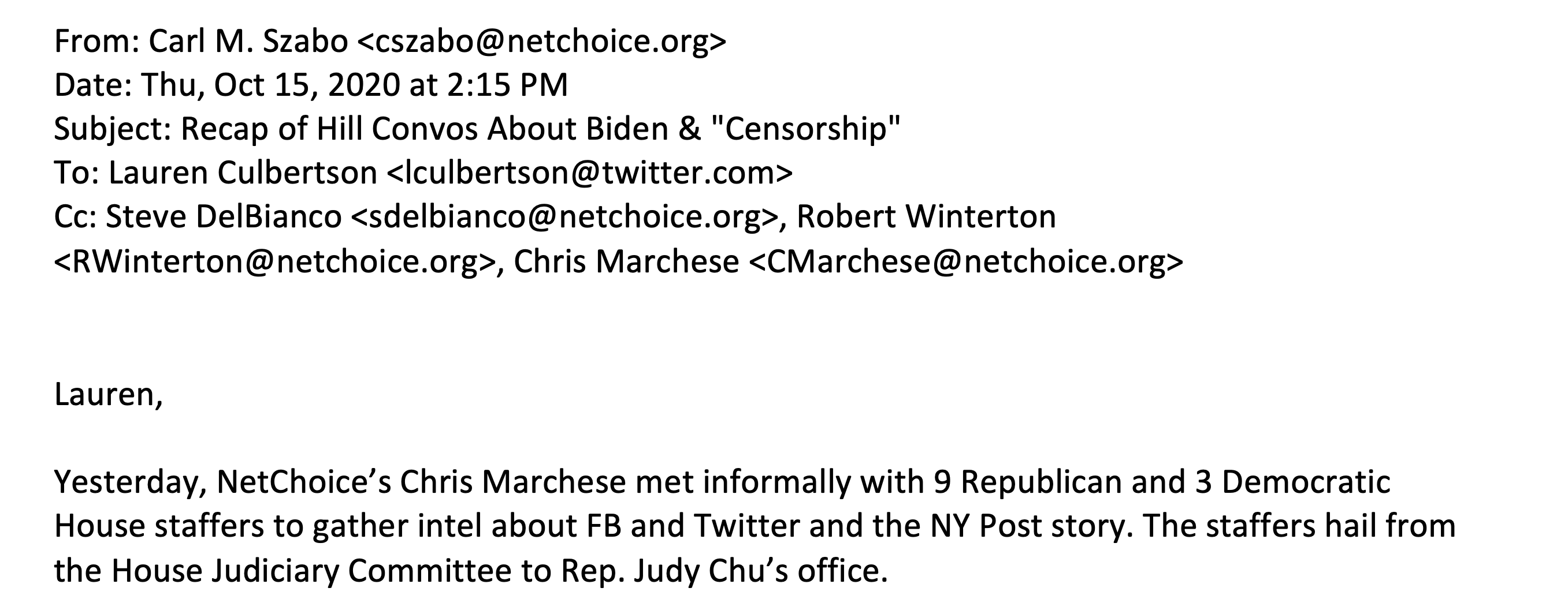 昨日、ネットチョイスのクリス・マルケスは、9人の共和党、3人の民主党の下院議員と非公式に会い、FBとTwitterとNYポストの記事について情報を集めました。