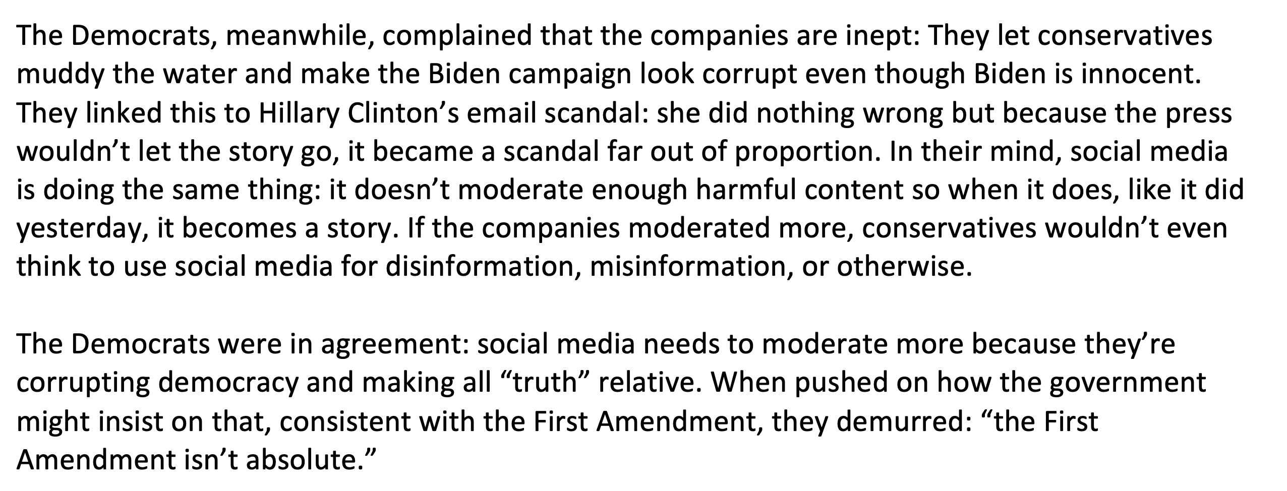 民主主義を堕落させ、すべての「真実」を相対化させているのだから、ソーシャルメディアはもっと規制する必要がある、というのが民主党の一致した意見でした。