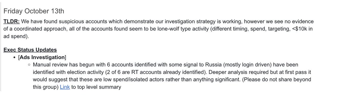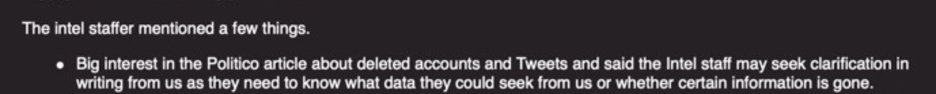 ・削除されたアカウントとツイートに関するポリティコの記事に大きな関心を持ち、諜報機関のスタッフは、彼らが私たちから求めることができるデータを知る必要があるため、または特定の情報がなくなっているのかどうか、私たちに書面で説明を求めることができると述べました。