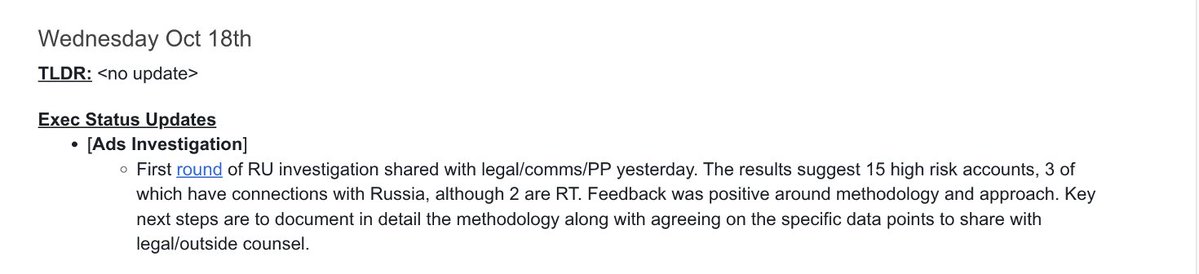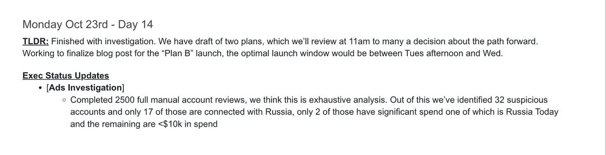 ツイッターはロシア問題がないと確信していたので、幹部は最高のPR戦略として、記録には何も書かず、静かにフェイスブックにレポーターを送りつけることに同意しました。