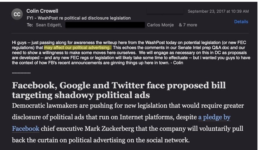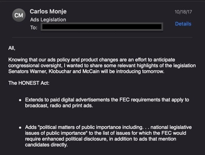 「私たちの広告ポリシーと製品の変更は、議会の監視を予想する努力であることを知って、私は上院議員ワーナー、クロブチャーとマケインが導入する法案の関連ハイライトを共有したいと思いました。」と、ポリシーディレクターのカルロス・モンジェは、直後に書きました。