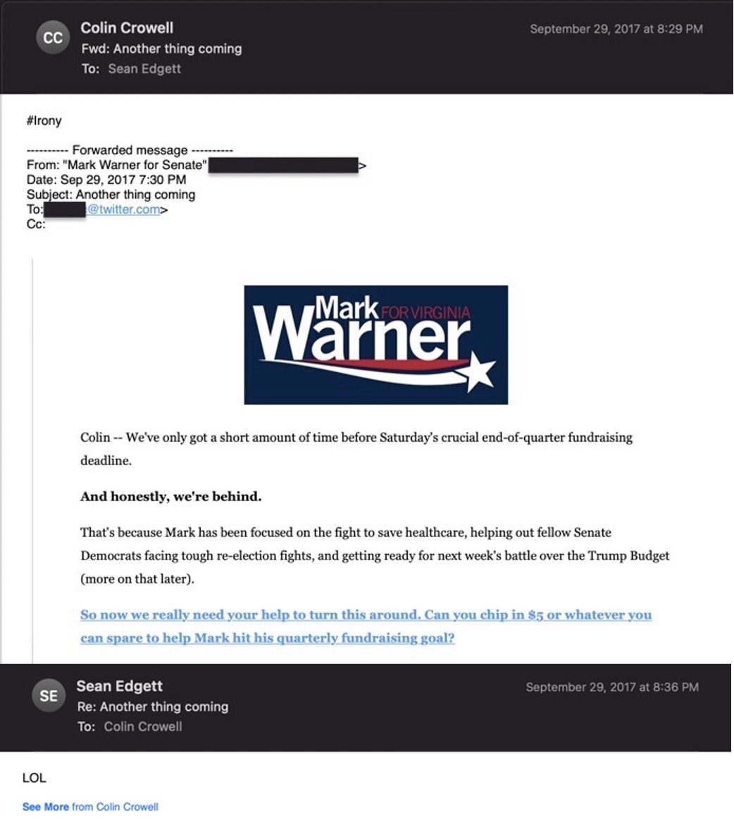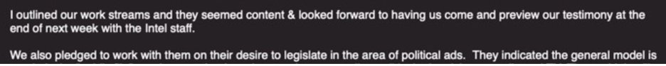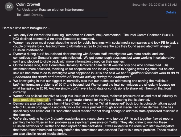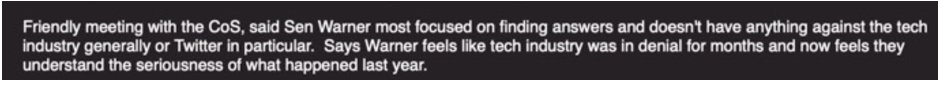 最初のブリーフィングから数週間後のワシントンでは、ツイッターのリーダーが上院のスタッフから、「ワーナー上院議員はハイテク産業が何ヶ月も否定されていたように感じている」と言われたそうです。