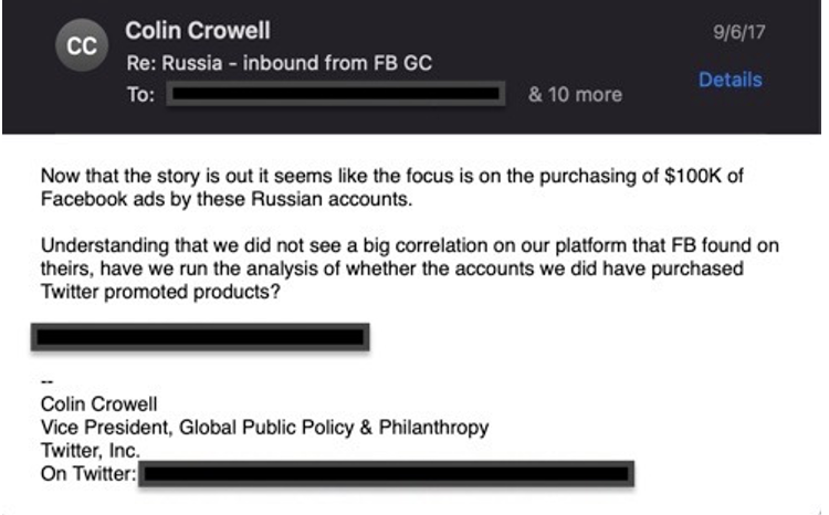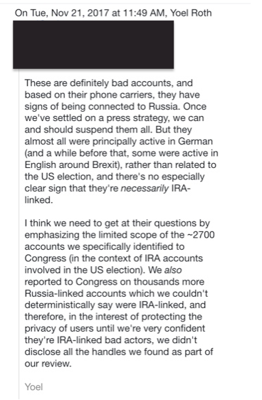 2017年9月、ツイッターはざっと検討した後、手動で調査したおよそ2700の容疑者のより大きなセットの中で、ロシアの可能性のある22のアカウントと、それらのアカウントへの「リンクの可能性がある」179のアカウントを停止したと上院に通知しました。