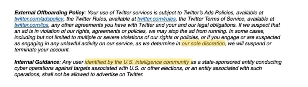 米国情報機関によって、米国またはその他の選挙に関連する標的に対してサイバー作戦を行う国家支援団体、またはそのような作戦に関連する団体と特定されたユーザーは、ツイッターで広告を出すことを許可されないものとします。