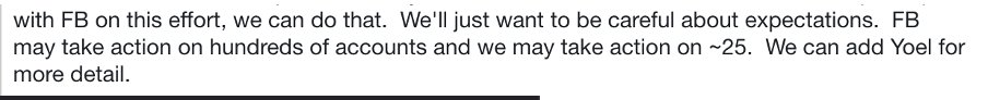 「FBは数百のアカウントに、我々は〜25のアカウントにアクションを起こすかもしれない。」