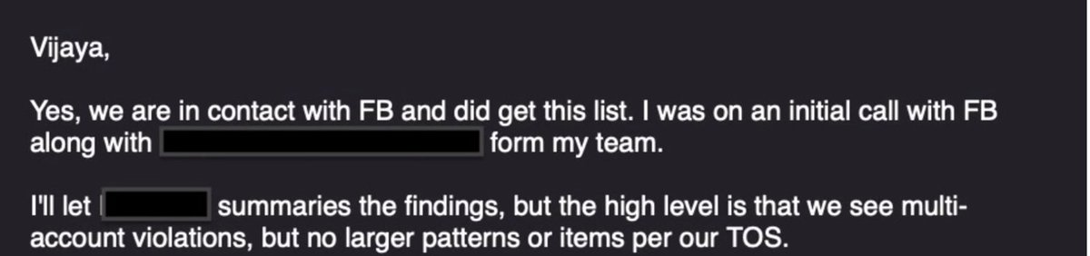 XXXが調査結果をまとめてくれますが、大まかには、複数のアカウント違反が見られるものの、大きなパターンや当社のTOSに基づく項目はないということです。