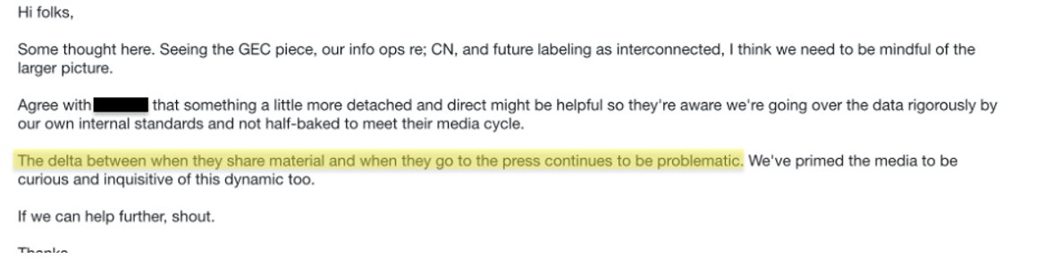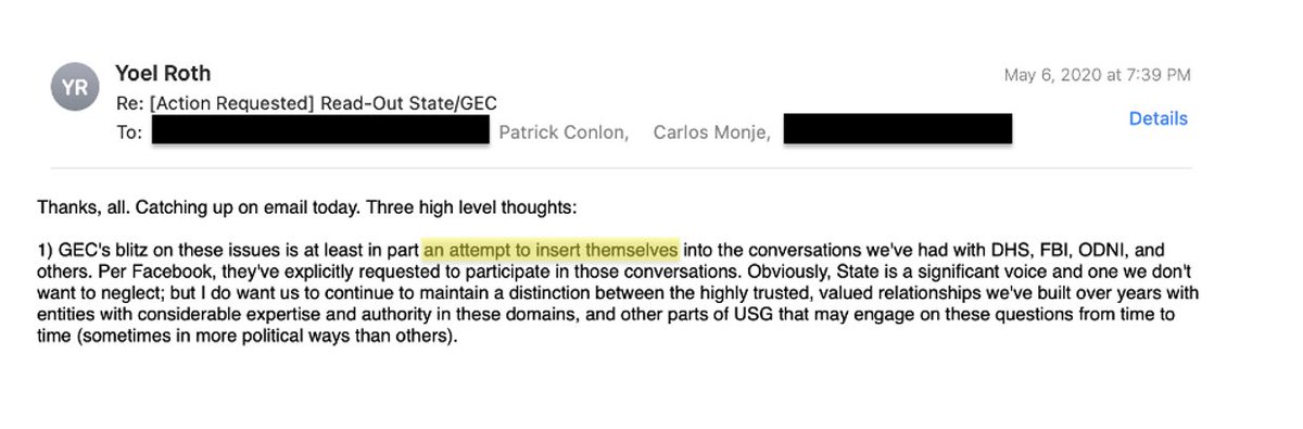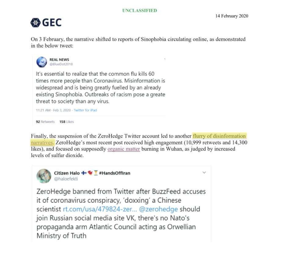 国務省はまた、ツイッターが米国の人気雑誌ゼロヘッジを禁止したというニュースをリツイートしたアカウントにフラグを立て、このエピソードが「偽情報のシナリオの別の乱舞につながった」と主張しました。
