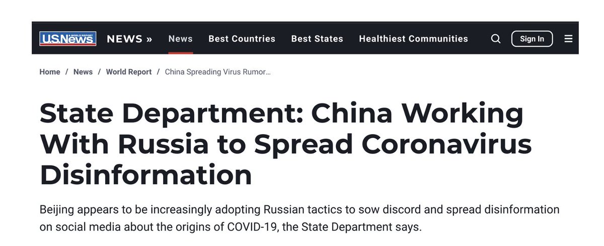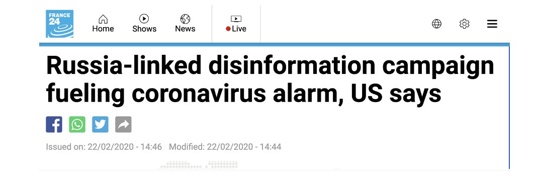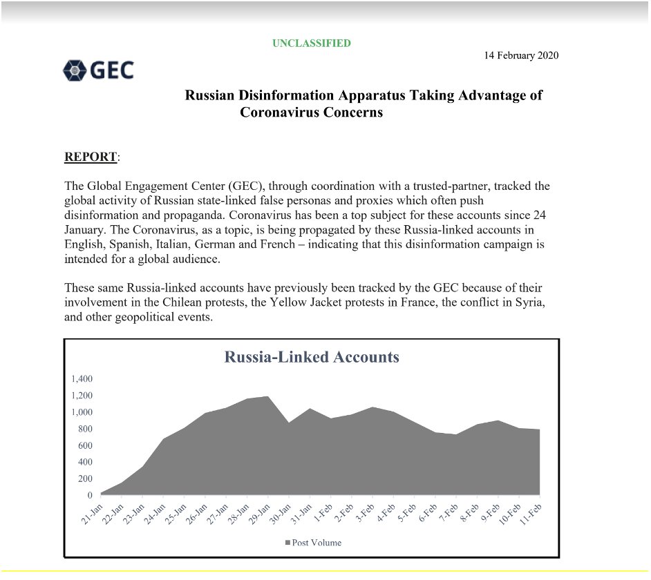 2020年2月、コロナパンデミックが勃発すると、国務省の駆け出しの分析・情報部門であるグローバル・エンゲージメント・センターは、「コロナウイルスの懸念に便乗するロシアの情報操作」というレポートをメディアに流しました。