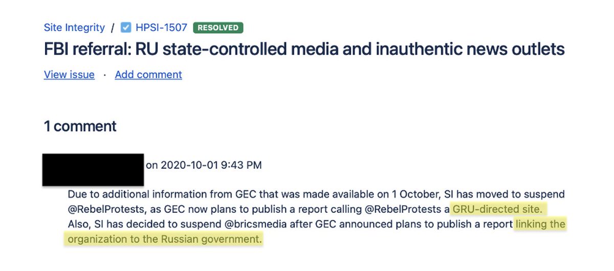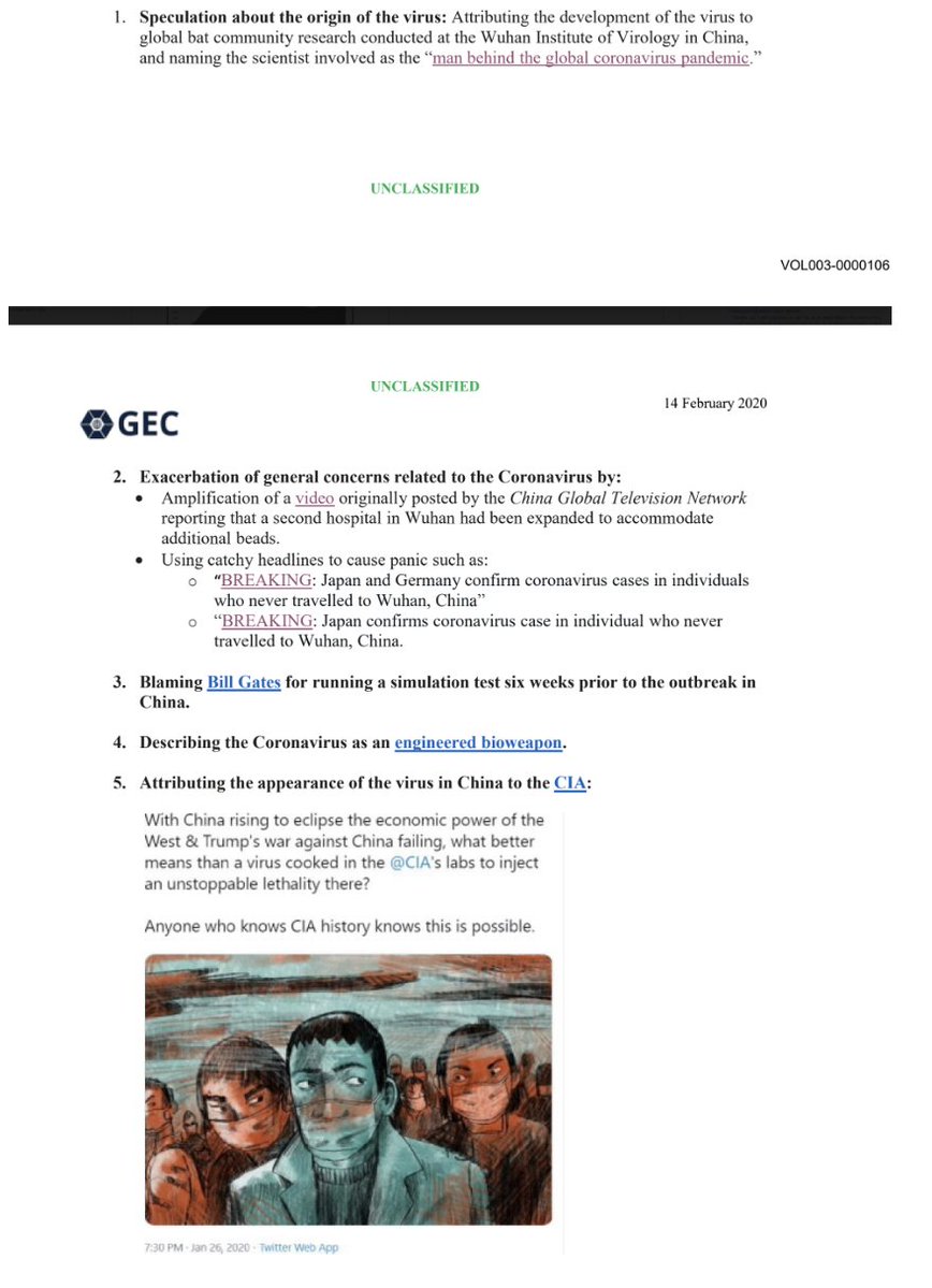 グローバル・エンゲージメント・センター(GEC)は、「コロナウイルスを人工生物兵器と表現する」、「武漢の研究所で行われた研究」を非難する、「ウイルスの出現をCIAに帰する」などの基準に基づいて、アカウントを「ロシアのペルソナおよび代理人」として要注意とのフラグを立てました。