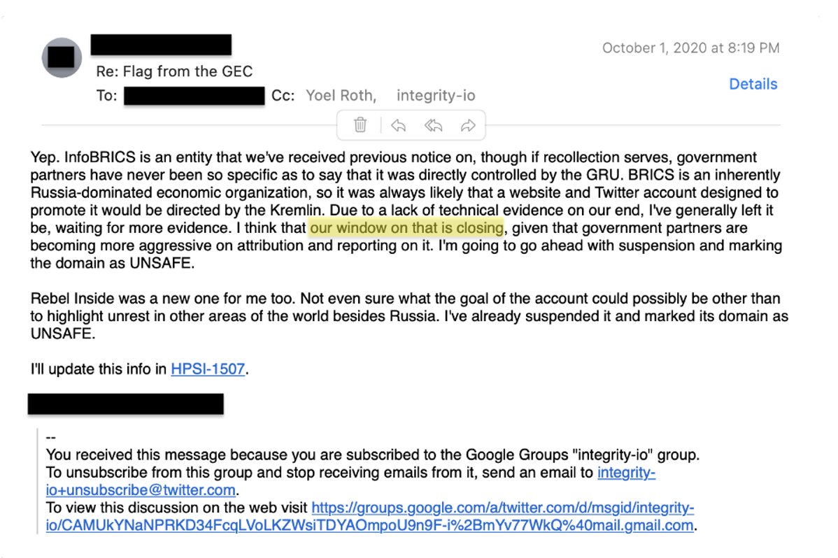 2020年になると、ツイッターは官民の機関が自分たちを迂回して、怪しいアカウントのリストをそのままメディアに流すという問題に悩まされるようになりました。