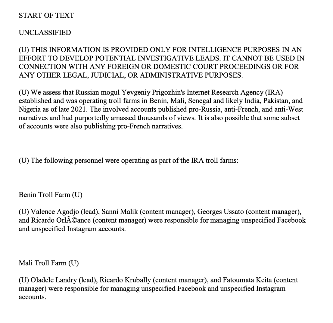 (U) 我々は、ロシアの大物エフゲニー・プリゴジンのインターネットリサーチ機関(IRA)が、2021年後半の時点で、ベニン、マリ、セネガル、そしておそらくインド、パキスタン、ナイジェリアにトロールファームを設立し、運営していたと評価しています。