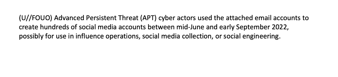 (U//FOUO) 高度な持続的脅威 (APT) サイバーアクターは、2022年6月中旬から9月上旬にかけて、添付のメールアカウントを使用して数百のソーシャルメディアアカウントを作成し、おそらく影響力作戦、ソーシャルメディア収集、またはソーシャルエンジニアリングのために使用しました。