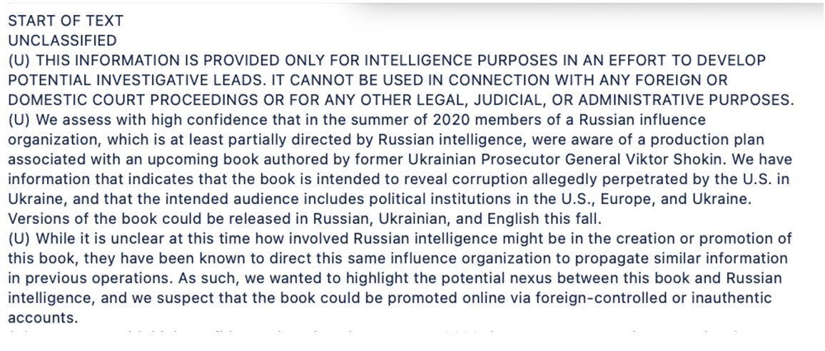 (U)我々は、2020年の夏、少なくとも部分的にロシア情報機関によって指示されているロシアの影響力組織のメンバーが、ウクライナの元検察長官ヴィクトール・ショーキンが執筆した近刊の本に関連する制作計画を知っていたと高い確信を持って評価しています。