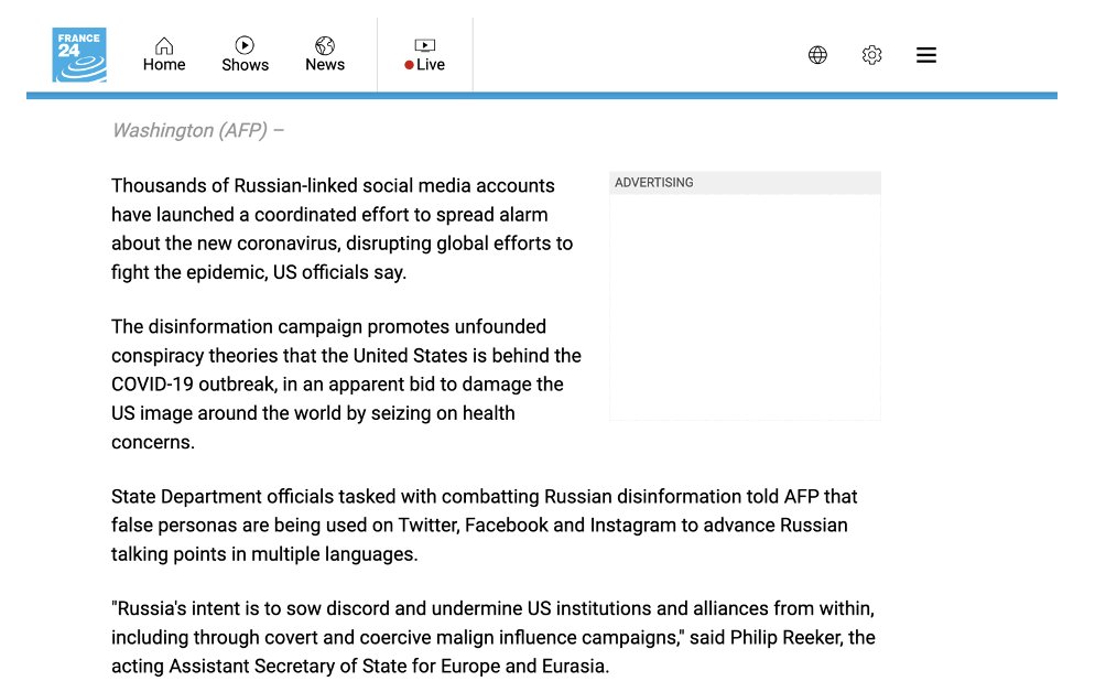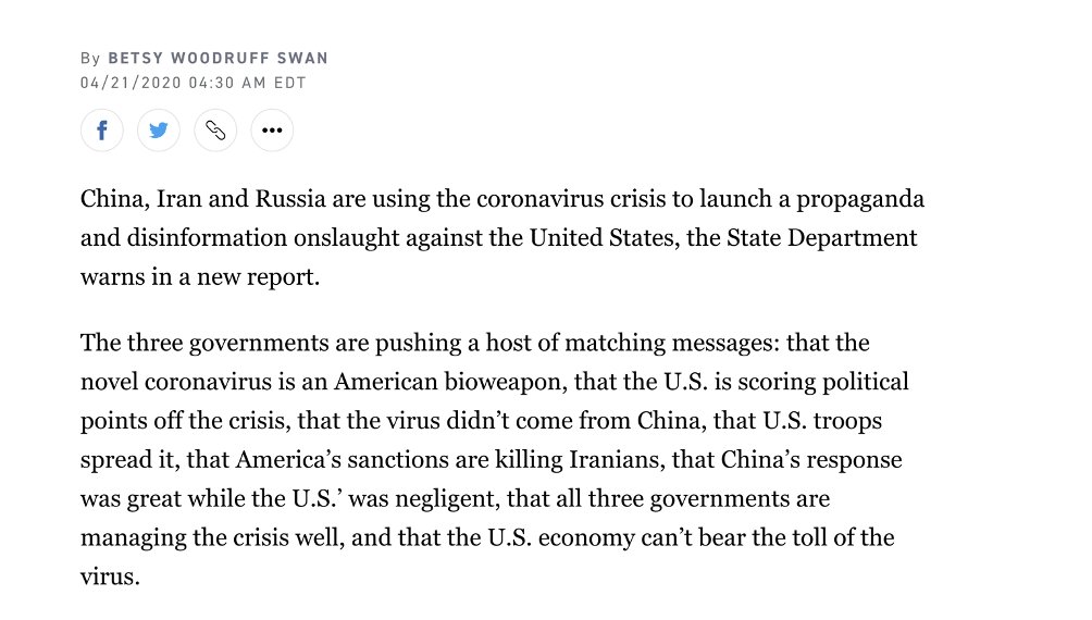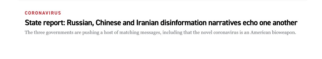 グローバル・エンゲージメント・センター(GEC)はやはりAFPの見出し、「ロシアに関連した偽情報キャンペーンがコロナウイルス警報につながったと米国が発表」や、「ロシア、中国、イランの偽情報が互いに影響し合う」というポリティコの記事といったニュースに直接つながっています。