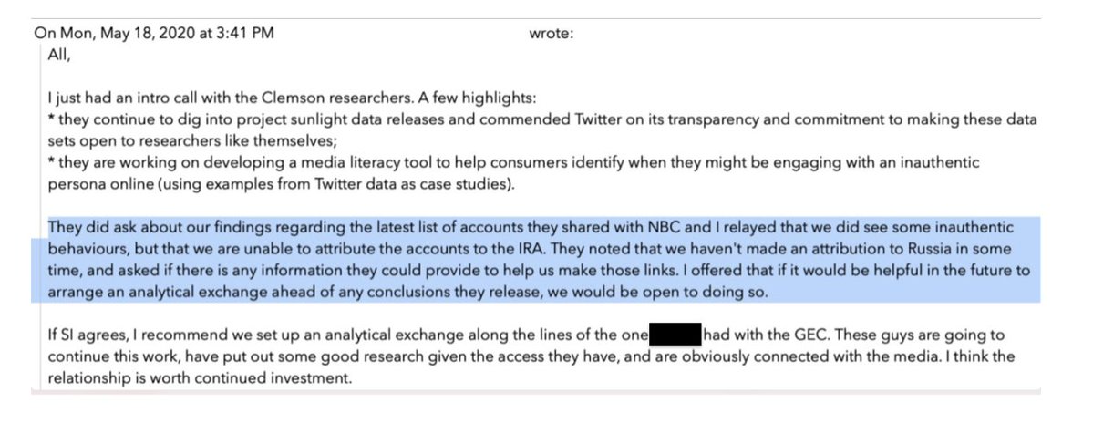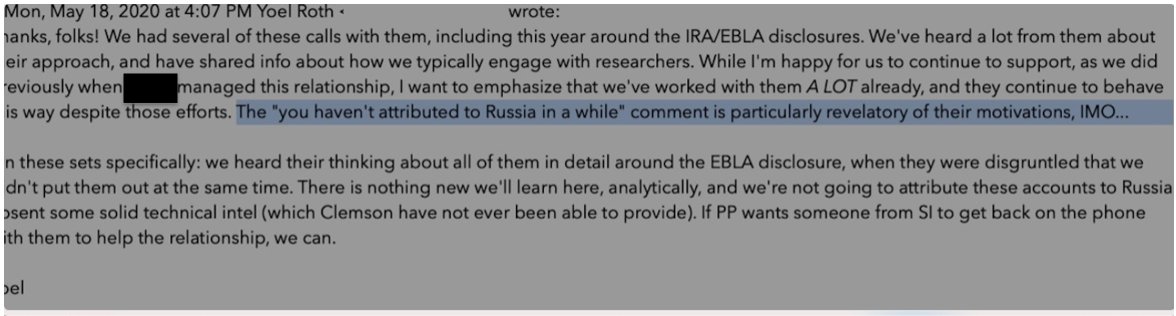 「しばらくの間ロシアのせいにはしていなかった」クレムソン大学のメディア公式監査ハブが、「ツイッターはしばらくの間、ロシアのせいにしなかった」と訴えると、信頼と安全チームの主任ヨエル・ロスは「彼らの動機の暴露だ」と述べました。