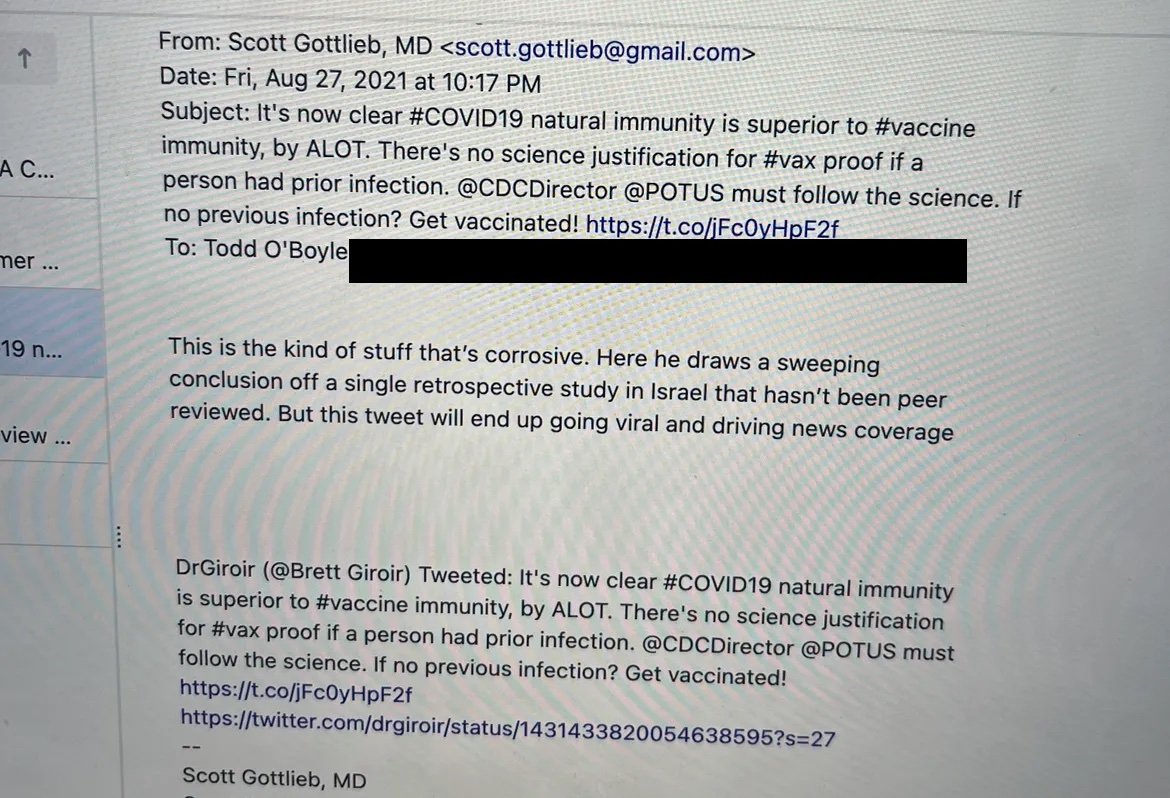 オボイル氏は、このレポートを転送する際に「前FDA長官ゴットリーブ」に言及し、再びゴットリーブ氏が現在ファイザー社で働いていることを無視したのです。