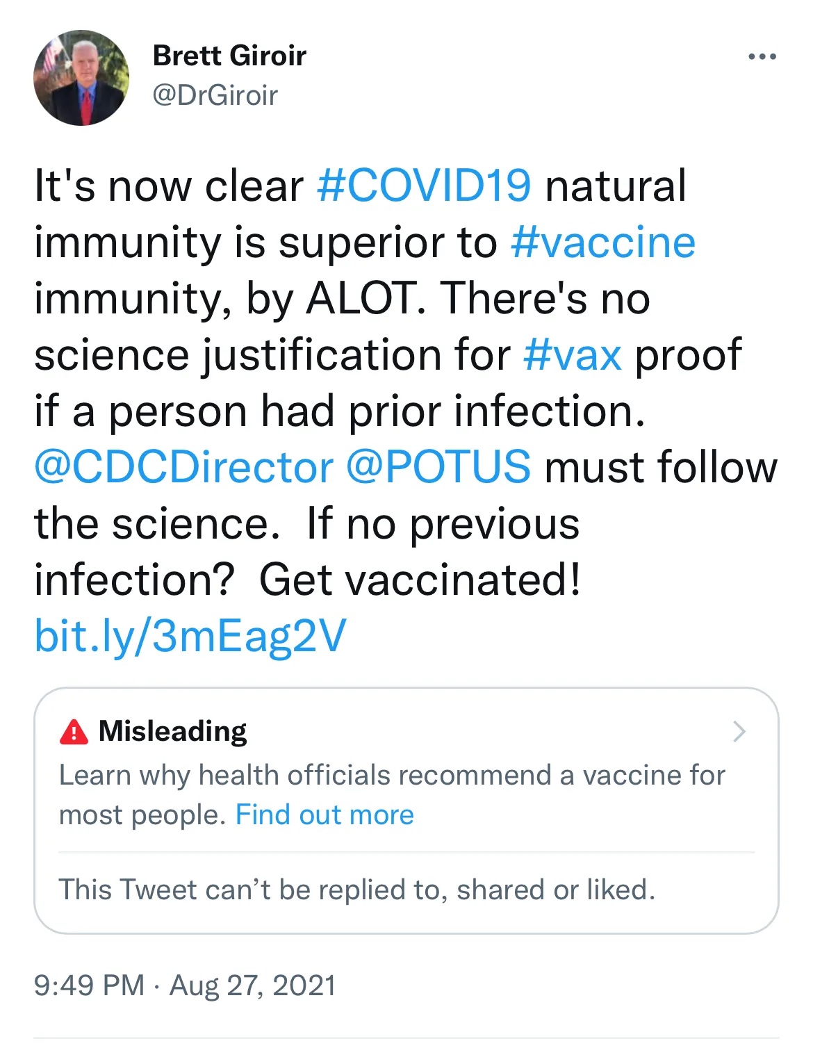 しかし、ブレット・ジロワールの自然免疫に関するツイートは、「敬意ある議論と対話」の定義そのものでした。