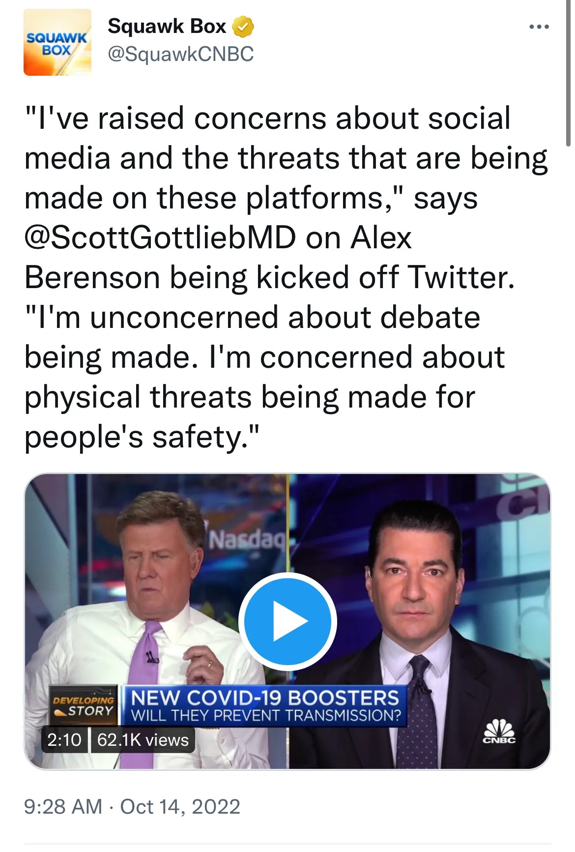 「私はソーシャルメディアとこれらのプラットフォームで行われている脅威についての懸念を提起しました」とアレックス・ブレンソンがツイッターから追い出されたことについて@ScottGottliebMDは述べています。