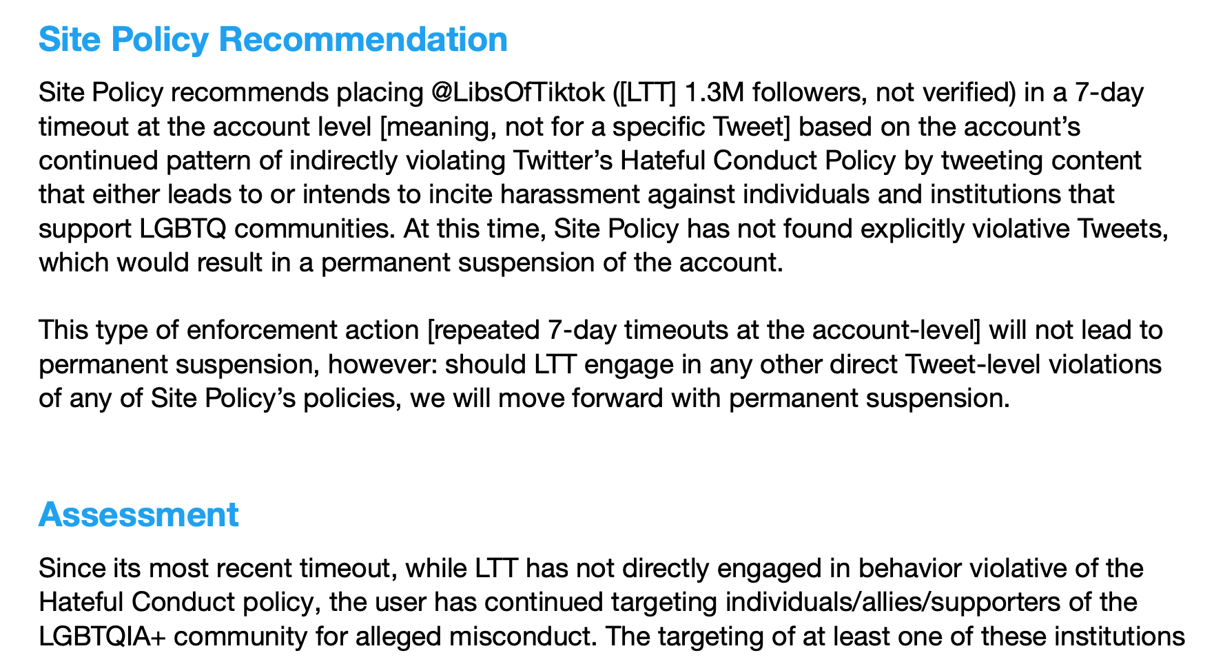 サイト・ポリシー・チームは、@LibsOfTiktok (LTT 130万フォロワー, 未認証) を、 LGBTQコミュニティを支援する個人および施設に対する嫌がらせにつながる、または扇動することを意図した内容をツイートして、