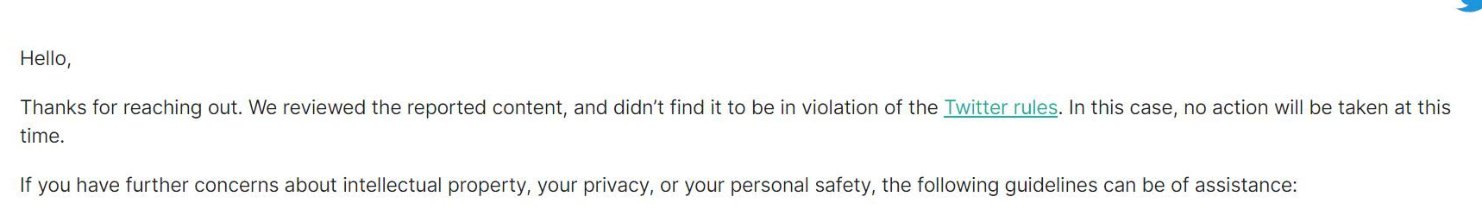 「報告された内容を確認しましたが、ツイッターのルールに違反しているとは認められませんでした。」