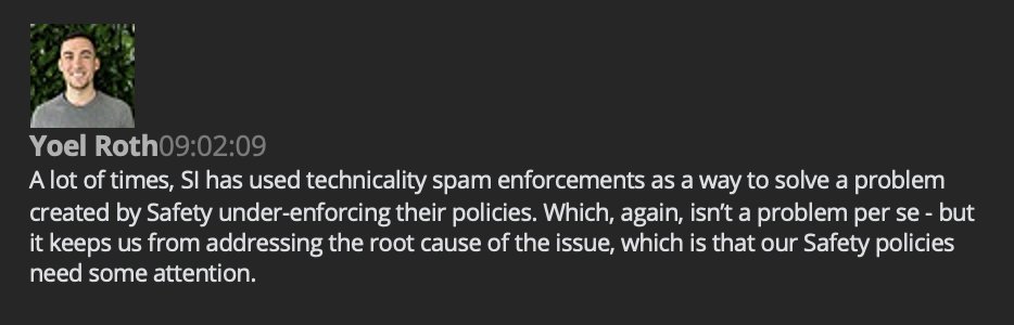 多くの場合、SIは、セーフティ・チームがポリシーを十分に適用していないことによって生じた問題を解決する方法として、技術的なスパムの強制を使用してきました。