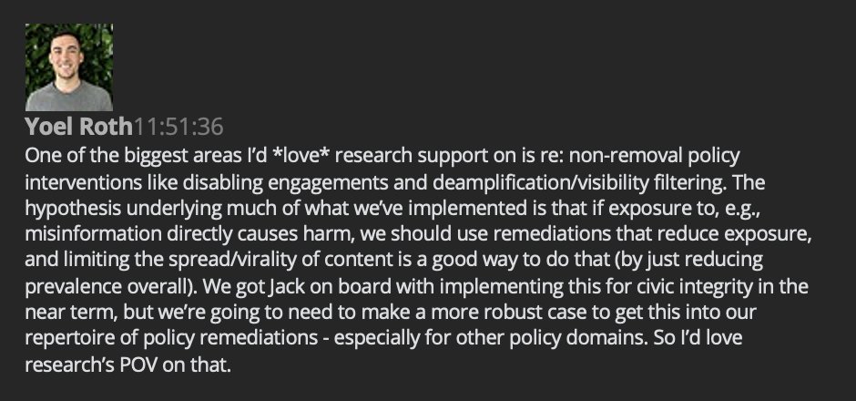 「私たちが実施したことの多くの根底にある仮説は、例えば誤報への暴露が直接的に害を及ぼすのであれば、暴露を減らす是正措置を用いるべきで、コンテンツの拡散/毒性を制限することはそれを行う良い方法である。」