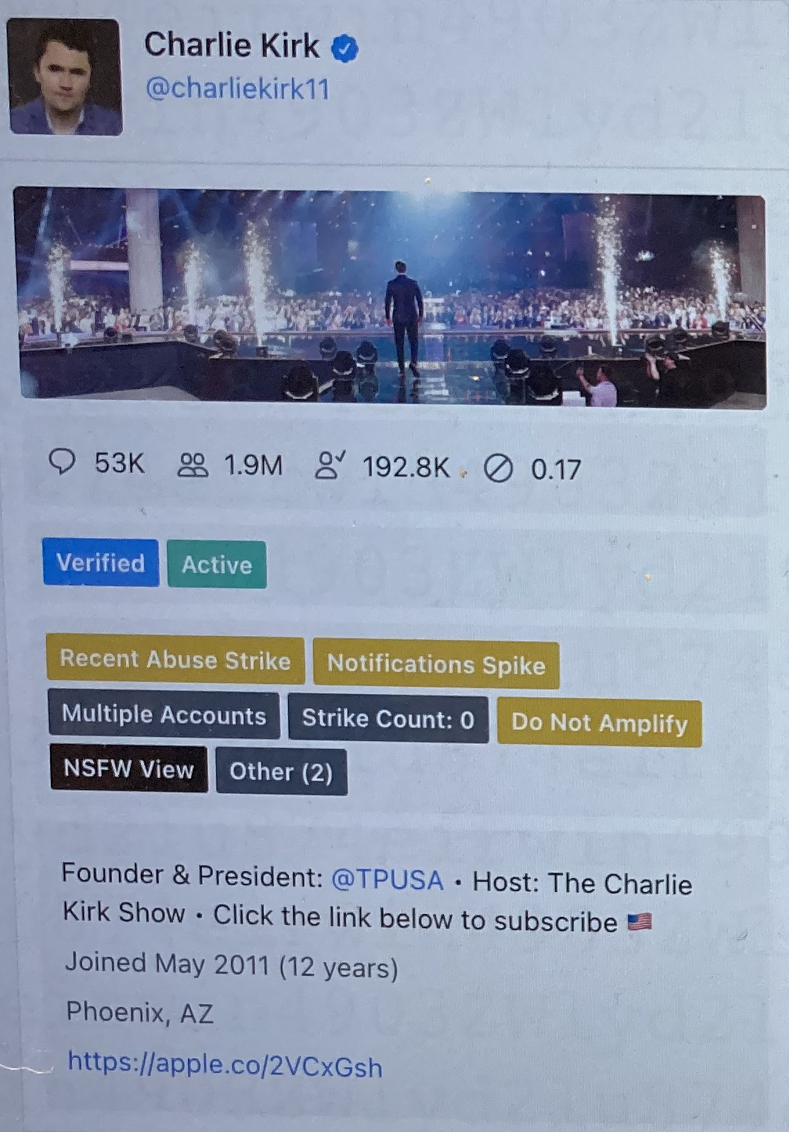 ツイッターは、保守派活動家チャーリー・カーク氏のアカウント( @charliekirk11)を「拡散させない」に設定しました。