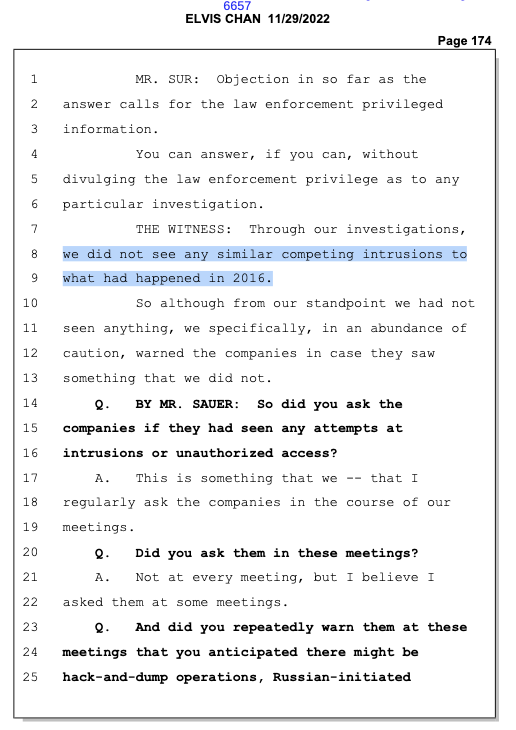 「私達の調査を通して、2016年に起こったことと類似したような、敵国による侵入を発見しませんでした。」と、FBI捜査官エルビス・チャンは、11月に認めました。