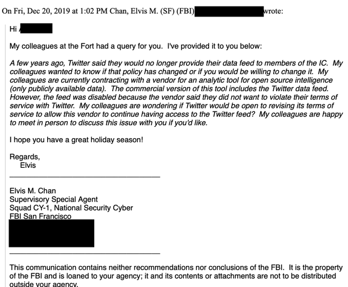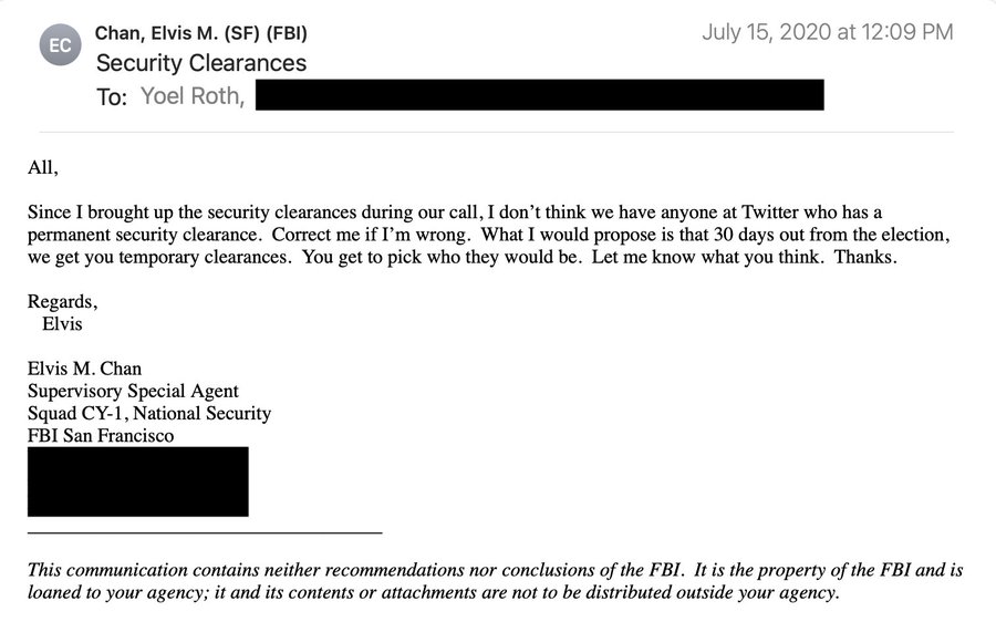 ・FBIはツイッター幹部に対し、FBIの機密情報を閲覧できる権限を与えた
