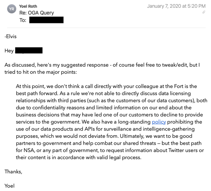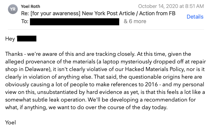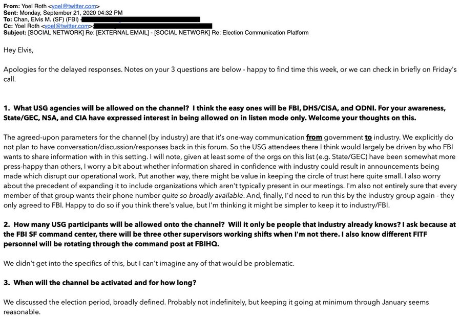 ツイッターのサイト・インテグリティ責任者(当時)のヨエル・ロスに10個の文書を送信しました。