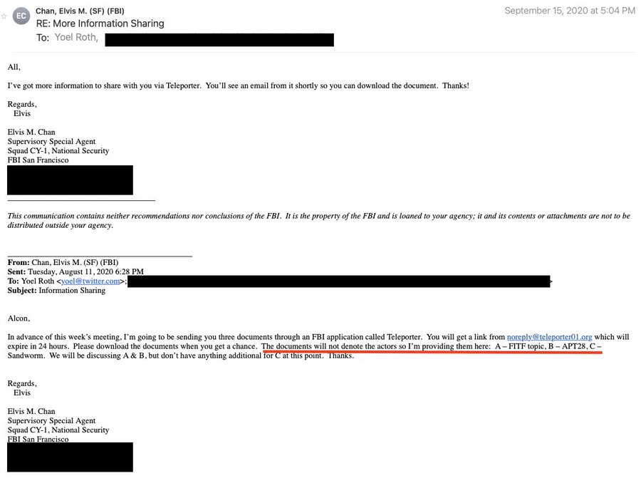 米国東部時間午後9時22分(日本時間午後6時22分)、FBI特別捜査官エルビス・チャンが、FBIからツイッターへの一方的な通信チャネルであるテレポーターを通じて、