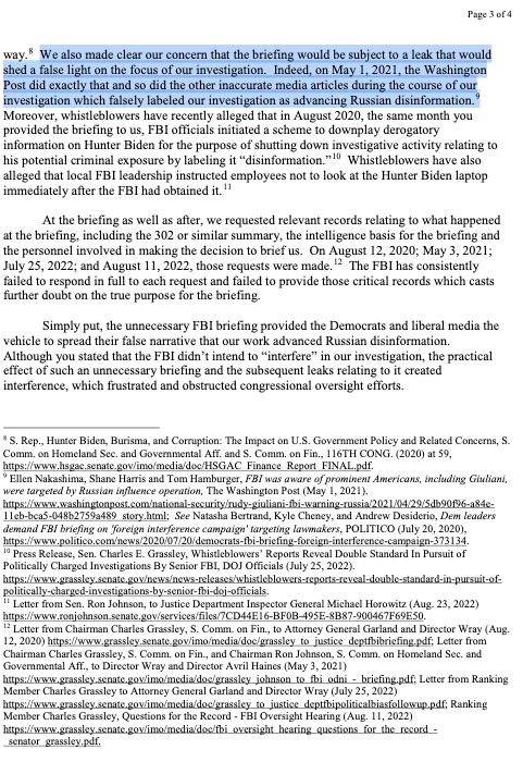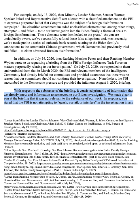 さらに、内部告発者は最近、あなたが私たちにブリーフィングを提供したのと同じ月である2020年8月に、FBI職員がハンター・バイデンの潜在的な犯罪暴露に関する捜査活動を停止する目的で、彼の軽蔑的な情報を “偽情報 “というレッテルを貼って軽視する計画を開始したと申し立てています。