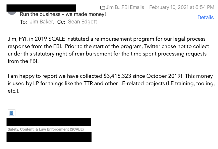 このプログラムを開始する前に、Twitterは、FBIからの要求の処理に費やした時間について、この法定償還請求権に基づいて徴収しないことを選択しました。